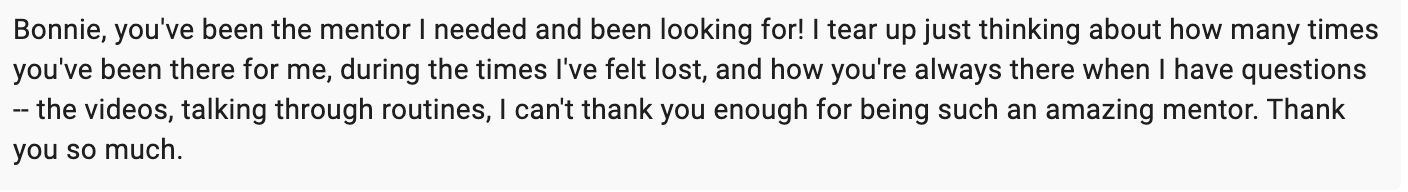 Upon joining, all members get a private 1:1 call with me. FREE access to every live class or workshop I offer outside the mentorship. Early invitations and discounts on other workshops/courses. AND Balanced Body alumni can AUDIT any course you have previously taken at NO COST.
